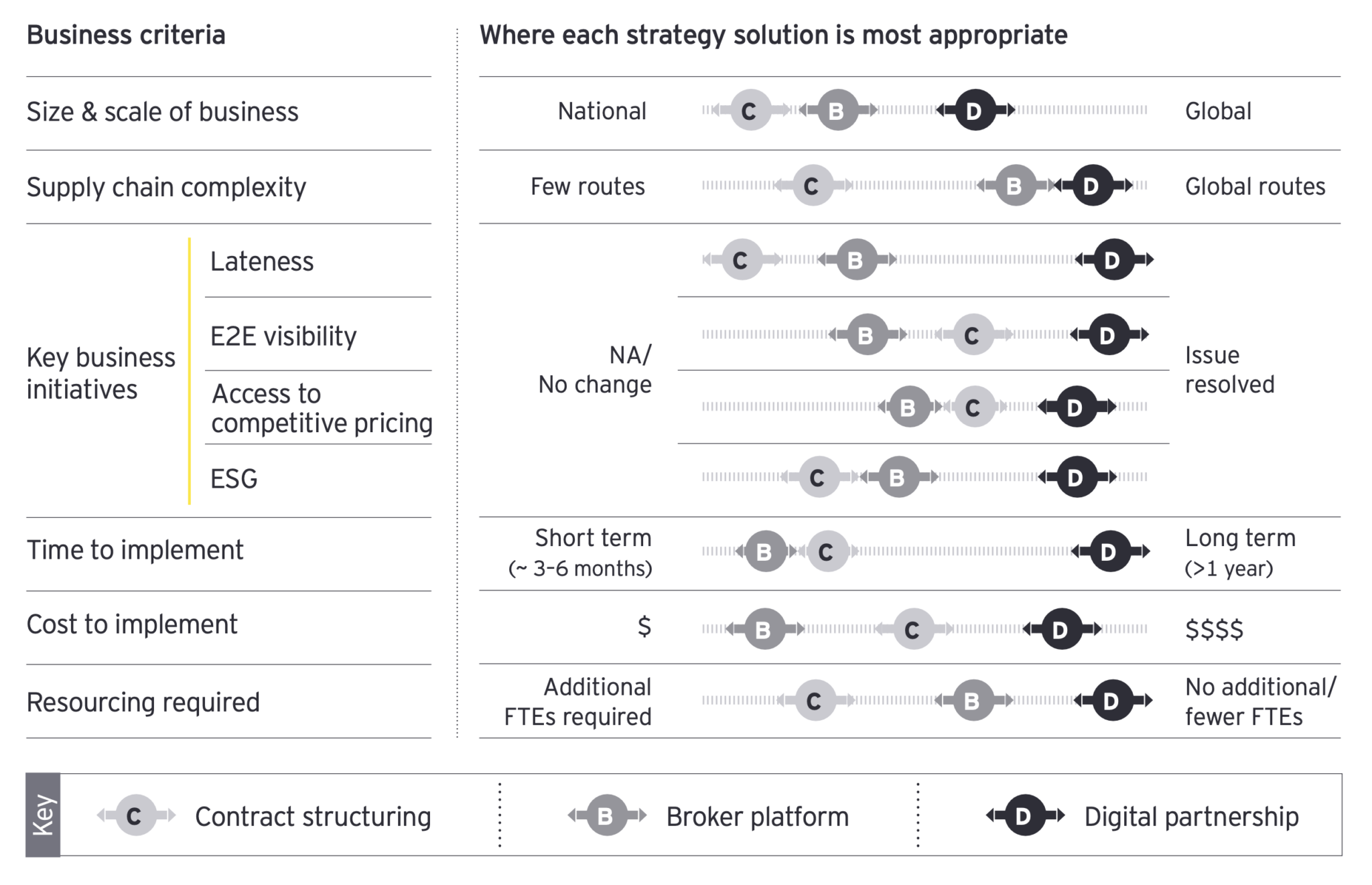 Then there’s an integrated service offering with more visibility to availability and tracking and pricing. This solution trends towards the middle, between the more localized international scale and size of business with a mid- to high-volume of supply chain complexity. It’s actually less expensive to implement because the pricing is on the broker, where the contracting and indices is a lot of internal work. It does require more resourcing to manage than the contracting just in terms of ongoing monitoring.